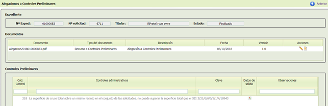 La pantalla muestra los distintos controles administrativos por expediente que son recurribles, facilitando de este modo la tarea por parte del solicitante/representante.