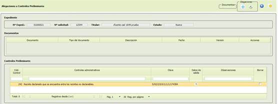 La pantalla permite las siguientes opciones, en relación con los documentos y las alegaciones: