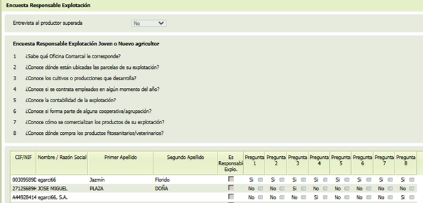 La pantalla se divide en tres partes: una superior que refleja si el productor ha superado la entrevista, un segundo bloque, que aglutina las preguntas que están planteadas para la encuesta en cuestión y la parte inferior donde aparecen los datos personales del solicitante y/o socios, que cumplen las condiciones para reflejarse en esta pantalla, check que indica si es responsable de explotación y los campos correspondientes a cada pregunta [Pregunta n] con las respuestas a éstas.