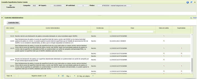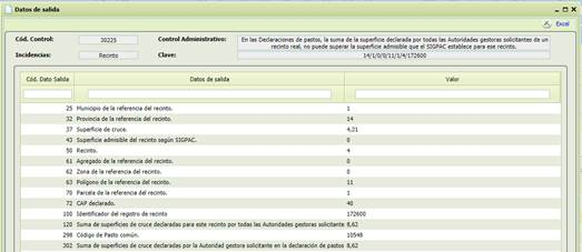 -[Datos de salida] Consiste en un icono por registro para acceder a los datos de salida de cada control administrativo. Si se pulsa la lupa muestra los datos de ese control e información de la clave en la siguiente pantalla: