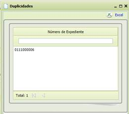 -[Duplicidades]: Permite consultar los controles con los que se han registrado duplicidades. Si se pulsa la lupa muestra las duplicidades en la siguiente pantalla: