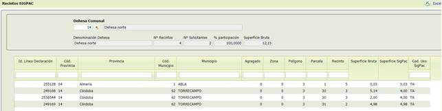 En la cabecera del formulario encontramos un filtro previo para seleccionar la Dehesa Comunal, al seleccionarla mostrará la siguiente información: