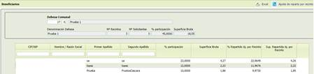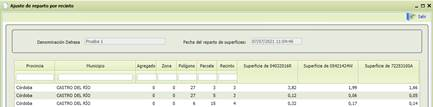 Botón “ajuste de reparto por recinto”abre un formulario con los recintos de esa dehesa y la superficie que declara cada uno de los beneficiarios en cada recinto. El formulario presenta el siguiente aspecto: