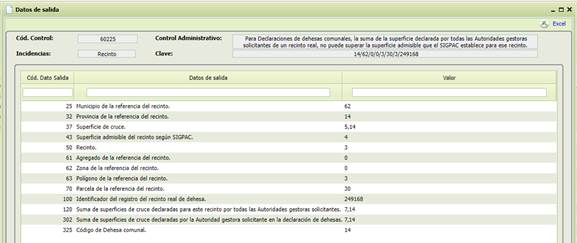 -[Datos de salida] Consiste en un icono por registro para acceder a los datos de salida de cada control administrativo. Si se pulsa la lupa muestra los datos de ese control e información de la clave en la siguiente pantalla: