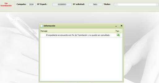 En el caso de los expedientes que se encuentren en estado de” Fin de tramitación”, aparecerá un mensaje en pantalla indicando que no puede ser consultado, ya que se trata de una consulta de controles preliminares.