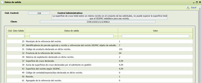 El cabecero muestra los datos del control administrativo seleccionado con anterioridad. Los datos de salida por código de control son los siguientes: