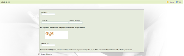 Si se ha olvidado el CIP se puede tramitar uno nuevo. Para ello se pulsa en el enlace “Olvidó su CIP” de la primera pantalla de autenticación y se accede al formulario que se muestra a continuación: