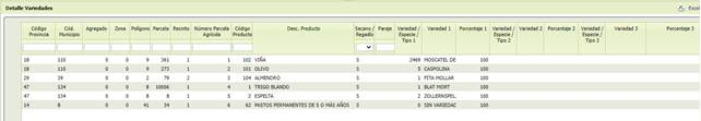 Desde esta opción se visualizan los datos de las variedades declaradas para cada recinto declarado y producto las distintas variedades que están cultivadas.
