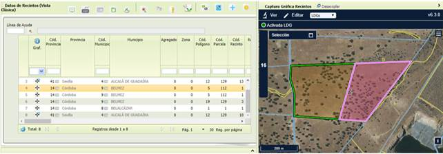 Si la información de los Datos de Recintos viene de una declaración con parte gráfica, en la botonera superior izquierda aparecerán los iconos de la declaración gráfica y la pantalla de los Datos de Recintos tendrá acoplada la parte Gráfica y se mostrará dividida en 2 partes Alfanumérica (habitual) y Gráfica.