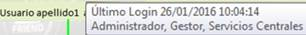 -Nombre y apellidos: se mostrará el nombre y apellidos del usuario que ha accedido. Al pasar el puntero del ratón sobre este campo, se mostrará información del último login y perfil o perfiles que el usuario tiene asociados al Control de Accesos.