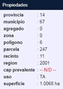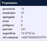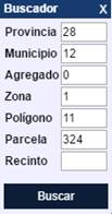 · Buscar parcela/recinto (ñ + B): muestra un panel donde introducir los códigos SIGPAC de la parcela o recinto a buscar. En caso de que no exista se mostrará un mensaje de error. Si existe se mostrará en la vista.