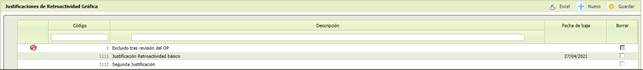 Formulario que muestra las distintas justificaciones asociadas a la Retroactividad Gráfica. Permite consultar y añadir justificaciones.