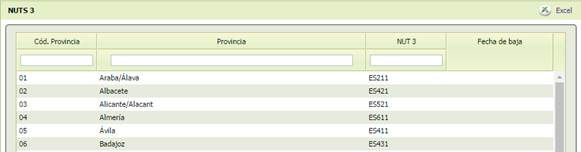 Tabla de consulta de los Códigos NUT (Nomenclatura de Unidades Territoriales) que en el caso de España (nivel 3) se corresponden con las provincias y consejos insulares (ver siguiente opción). No será posible modificar ningún dato.