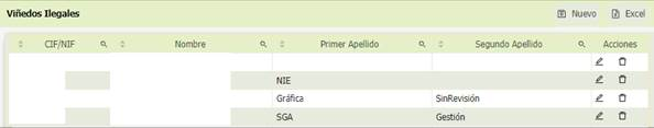Catálogo auxiliar que muestra los titulares con viñedos ilegales. Catálogo de consulta y modificación. Es posible dar de alta por OFAI o por pantalla