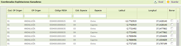 Catálogo auxiliar, visible desde campaña 2024. Muestra los datos cargados del fichero Coordenadas Explotaciones Ganaderas