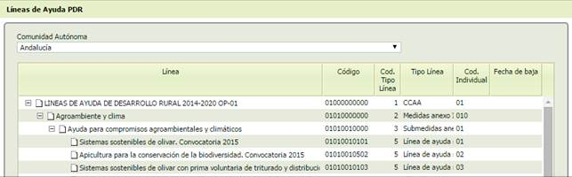 -[Línea] Listado extensible o comprimible (por medio de botoneso) en forma de árbol de las Líneas de Ayuda incluidos en las Medidas PDR de cada Comunidad.