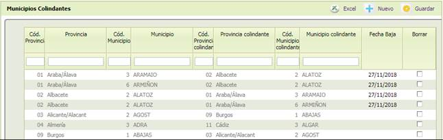 -[Cód. Municipio colindante] Código del Municipio INE incluido en la comarca. La lista de valores que se muestra pertenece a los códigos deMunicipios INEexistentes para la Provincia seleccionada. Obligatorio.