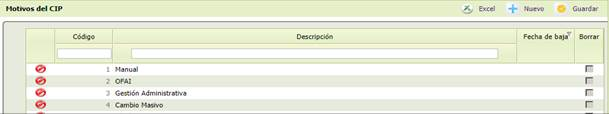- [Borrar] Casilla de verificación que permite realizar el borrado físico.