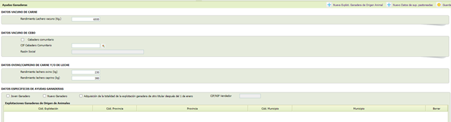 Únicamente cuando se soliciten las siguientes ayudas: “Ayuda para los ganaderos extensivos de vacuno de carne”, “Ayuda para el engorde sostenible de terneros”, “Ayuda para el engorde de terneros en la explotación de nacimiento”, “Ayuda para los ganaderos extensivos y semiextensivos de ovino y caprino de carne”, “Ayuda para la producción sostenible de leche de oveja y cabra” o “Ayuda para los ganaderos extensivos y semiextensivos de ovino y caprino sin pastos a su disposición y que pastorean superficies de rastrojeras, barbechos y restos hortícolas”, la pantalla presenta el siguiente aspecto, en caso contrario cada bloque mostrará un texto indicando que la línea no se encuentra incluida en la solicitud: