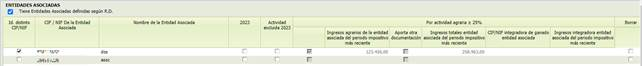 Si no hay ninguna Entidad Asociada que tenga marcada la casilla Actividad Excluida 2023 y la del motivo de exclusión Actividad agraria ≥ 25%, también se borrarán los datos cumplimentados en el motivo de exclusión Actividad agraria ≥ 25% del solicitante.