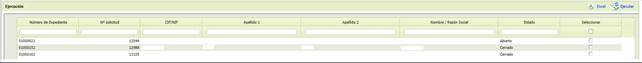 -[Seleccionar] Marca que indica que el expediente está seleccionado para desbloquearse. Se puede activar pulsando sobre la marca de cada registro, seleccionando directamente cualquier campo del registro o utilizando la funcionalidad: