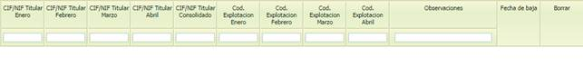 - [CIF/NIF Titular] Se trata de cuatro campos según las cuatro fechas de extracción posibles: enero, febrero, marzo y abril. Se cumplimenta con el identificador del titular de la explotación.