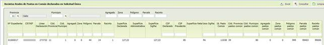 Tras realizar la consulta se mostrará la siguiente pantalla con los datos de recintos reales y los recintos de pastos en común correspondientes asociados al número de expediente donde se han declarado: