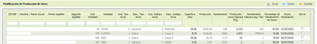 Definimos la pantalla que se muestra desde la opción de Modificación de Producción de Arroz por ser la más completa (la pantalla desde Consulta de Producción de Arroz no dispone de botoneras de acción):