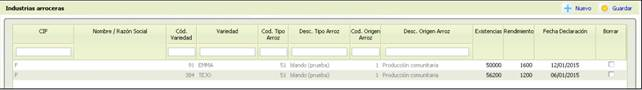 Definimos la pantalla que se muestra desde la opción de Modificación Industrias Arroceras por ser la más completa (la pantalla desde Consulta Industrias Arroceras no dispone de botoneras de acción):