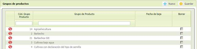 - [Cód. Variedad] Código de la variedad de arroz. Al dar de alta un nuevo registro habrá que introducir un código válido (presente en el catálogoGrupos de productos