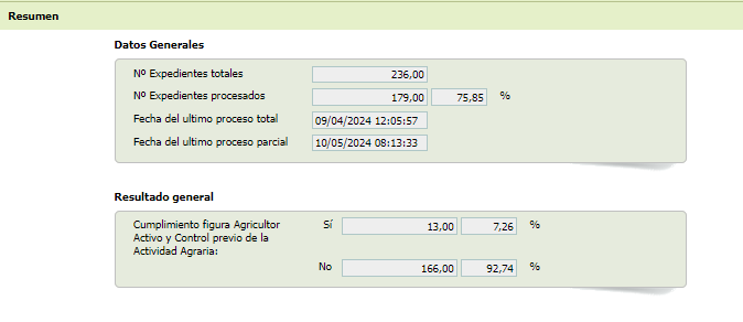 Se mostrará un cuadro resumen de los resultados del último proceso de cálculo de agricultor activo que se ha ejecutado en Gestiones administrativas / Ejecución procesos Agricultor Activo / Cálculo Agricultor Activo