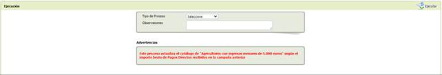 Aparece la advertencia: “Este proceso actualiza el catálogo de "Agricultores con ingresos menores de 5.000 euros" según el importe bruto de Pagos Directos recibidos en la campaña anterior”