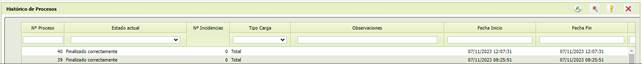 Los campos y funcionalidades que muestra la pantalla están desglosados en Histórico de Procesos del apartado de Agricultor Activo (aunque no aparecen las columnas de [Expediente desde] y [Expediente hasta] ya que se trata de un proceso total).