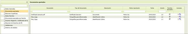 Este bloque permite consultar los documentos que se hayan asociado a recintos en la alegación a la Solicitud Única. Aparece en todos los tipos de alegaciones y presenta el siguiente aspecto:
