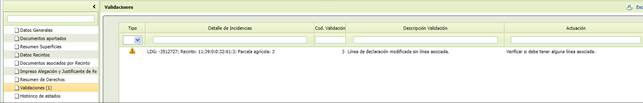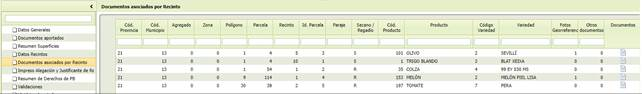Este bloque de información muestra los datos de los recintos sobre los que se han realizado las alegaciones a la solicitud única en modo Consulta. Esta opción del menú se muestra únicamente para los tipos de alegaciones que permiten realizar modificaciones sobre este tipo de información. De este modo, se mostrará para las alegaciones que se presenten por los siguientes motivos: