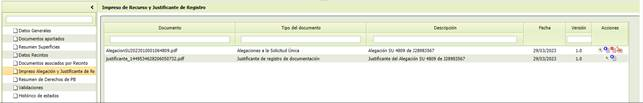 En este bloque se podrá consultar el impreso de la alegación y el justificante de registro que se genera al registrar la Alegación a la Solicitud Única a través del portal del ciudadano en todos los tipos de alegación. Presenta el siguiente aspecto:
