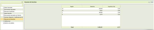 Muestra el resumen del número de derechos asignados por región y las superficies admisibles. La pantalla es similar a la explicada en Resumen de Derechos.