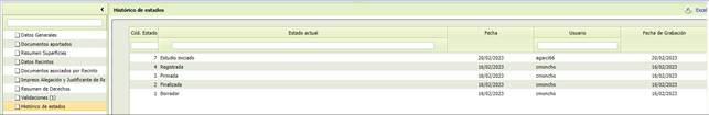 Desde esta opción se visualiza, también en todos los tipos de alegación, el histórico de cambios de estado de las mismas. Se podrá exportar la información de la tabla al PC del usuario en formato Excel por medio del icono