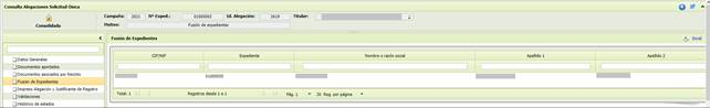 Opción que aparece únicamente en las alegaciones del tipo homónimo. Permite consultar los CIF/NIF de los expedientes a fusionar con el del titular que da de alta la alegación. Presenta el siguiente aspecto:
