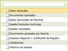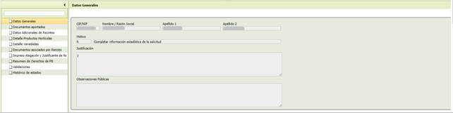 Para el tipo de solicitud “Completar información estadística de la solicitud”, se mostrarán además las siguientes opciones de menú: Datos Adicionales de Recintos, Detalle Productos Hortícolas y Detalle Variedades:
