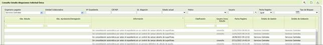 en alguno de los registros, se accede a la pantalla Consulta Alegaciones Solicitud Única, en la que se muestran los detalles propios del tipo de alegación que se haya seleccionado. El estudio de la alegación se puede consultar por medio de la opción “Consultar”