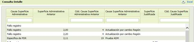 - [Superficie Justificada Anterior] Valor anterior a la actualización de la Superficie Justificada. Si el campo no muestra ningún valor, es que no ha sufrido cambios.