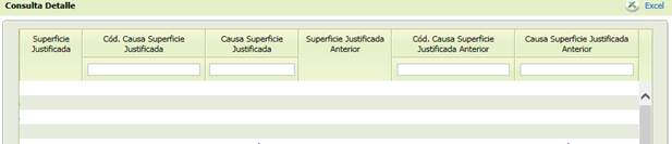 - [Cód. Causa Superficie Justificada anterior] Causa Superficie Justificada anterior. Valor anterior a la actualización del Cód. Causa Justificada. Si el campo no muestra ningún valor, es que no ha sufrido cambios.