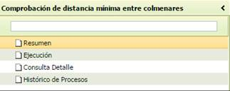 Se accede por medio de la decimocuarta opción del menú de Ejecución de Procesos: Comprobación de distancia mínima entre colmenares. Esta opción consta de cuatro apartados tal y como muestra la aplicación: