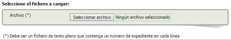 También se da la posibilidad de anexar y subir un fichero tipo TXT con los números de expediente que se desea incluir en el proceso. En el desplegable del campo [Tipo de proceso] se deberá seleccionar la opción “Fichero”. En este caso aparecerá el siguiente campo y leyenda para subir el fichero: