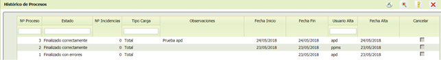 - [Cancelar] Marcas de borrado físico. Estarán activas únicamente con [Estado] “En proceso”, para seleccionar un proceso en curso que no finaliza y así detenerlo.