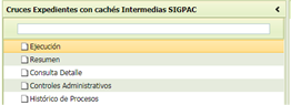 Con usuario “Modificación”, Se accederá desde la opción de menú de Ejecución de Procesos a los Cruces Expedientes con Cachés Intermedias SigPac. Esta opción consta de cinco apartados tal y como muestra la aplicación: