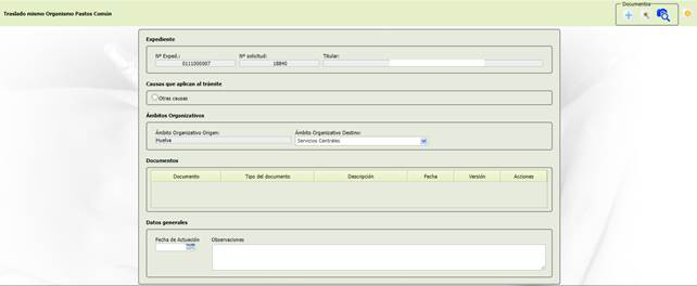 Tras seleccionar un expediente concreto al que se le va a trasladar dentro del mismo O.P., inicialmente la pantalla presenta el siguiente aspecto:
