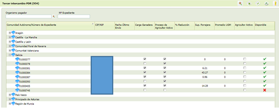 Tras seleccionar la Comunidad Autónoma de ubicación de los recintos, se iniciará el intercambio de todos los expedientes pertenecientes a dicha comunidad, con la siguiente pantalla:
