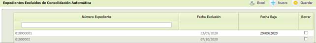 Pantalla que muestra los expedientes excluidos de consolidación automática. Permite generar Excel y añadir expedientes.